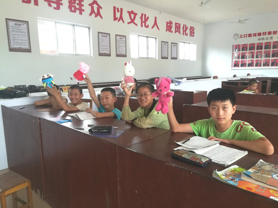 回答问题得到奖品的孩子们。这些玩偶就是我们之前在学校募捐得到的,之后我们还会举行多种形式的小比赛,并把它们作为奖品发放给孩子们。