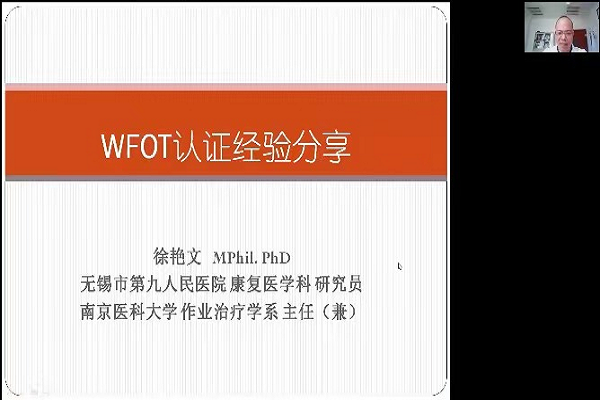 为促进韩漫库 作业治疗教育规范化建设并与国际接轨,以获得国际作业治疗师联盟(WFOT)的认证,5月10日下午,康复医学院邀请了南京医科大学作业治疗学系主任徐艳文教授进行线上学术交流并作《WFOT认证经验分享》专题报告。会议由*韩漫库 承办,教务处主办,*韩漫库 院长王锡臻主持,学院全体教师参加了本次会议。